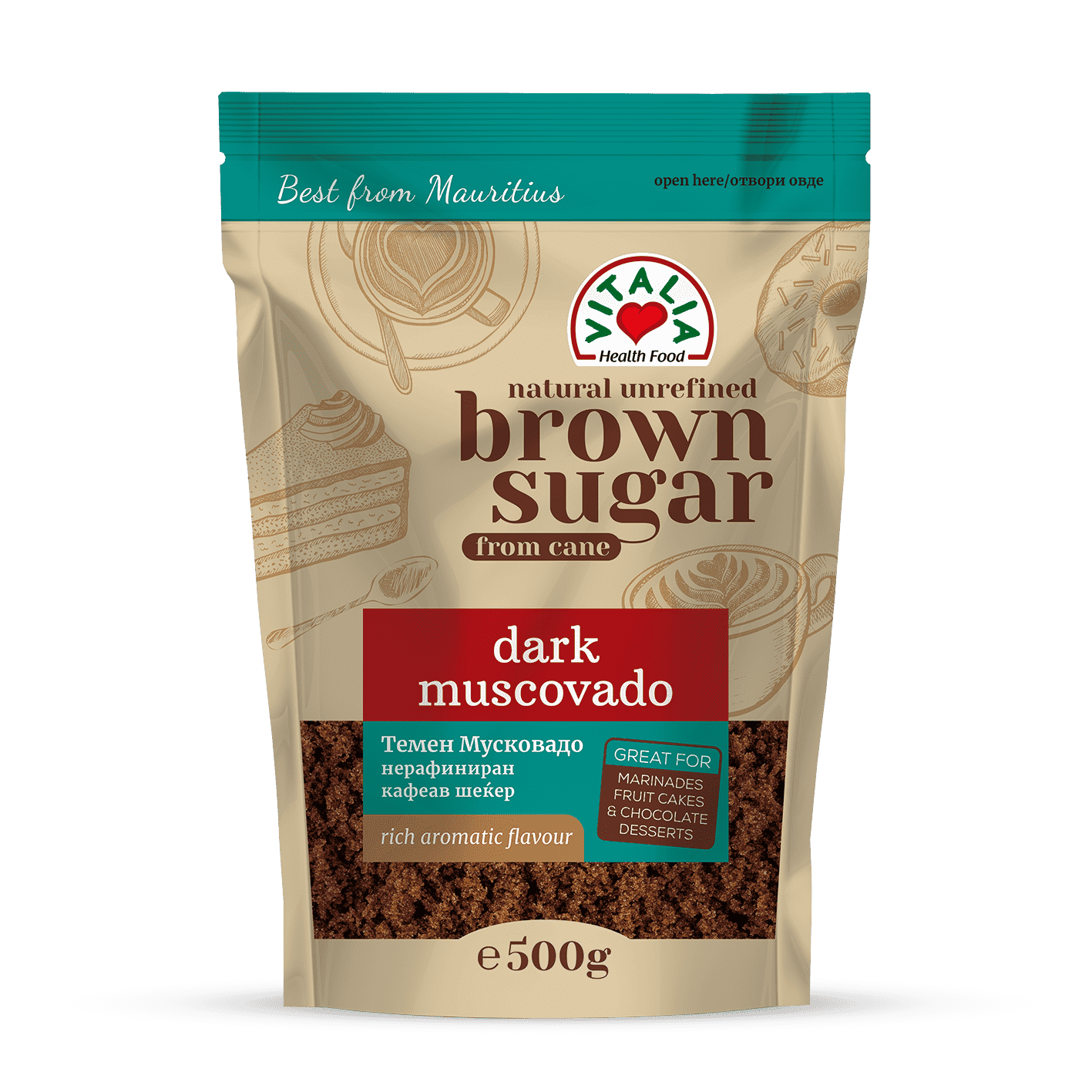 Кафеавиот шеќер Dark Muscovado на Виталиа потекнува од Јужна Африка, од островот Маурициус каде тропската клима и незагадената почва овозможуваат да се произведе најквалитетен нерафиниран шеќер во светот. ВИТАЛИА кафеавиот шеќер е произведен на едноставен начин, со цел да се задржи, а не да се одстрани, природната меласа на шеќерната трска.