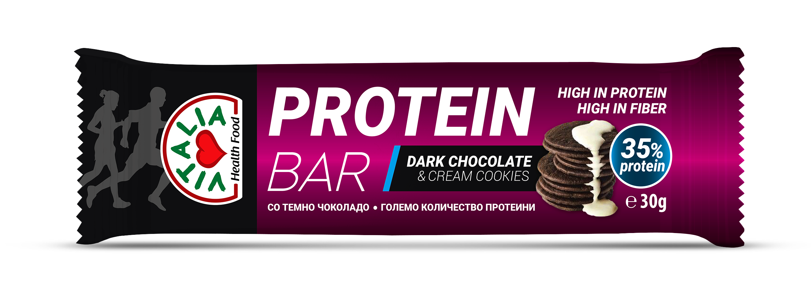 darkchocolate, proteinrich, cookies, cream,Протеин барот со колачи и темно чоколадо е вкусна комбинација од крцкави колачиња со крем, надополнети со неодоливо темно чоколадо, вистински рецепт за комплетно задоволство.
