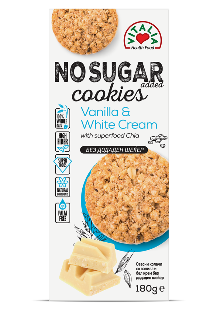 Виталиа овесни колачи со бел крем, неодолив и вкусен рецепт, без додаден шеќер!! 100% овесни снегулки богати со влакна (бета-глукан) кои го регулираат крвниот холестерол. Дополнително, овесот е богат со протеини, витамини А, Д и Б, како и во минерали како што се железо калциум, фосфор, калиум, бакар, цинк, манган, натриум, магнезиум. Богатата композиција со есенцијални аминокиселини го стимулира создавањето на црвените крвни клетки. Калциумот и магнезиумот, во комбинација со витамин Д, ја зголемуваат апсорпцијата, ги зајакнуваат коските и кожата и ја одржуваат силата на косата. Целозрнестите овесни снегулки постепено ја ослободуваат енергијата, и поради тоа останувате полни со енергија во текот на целиот ден. Комбинацијата на јатки помага во регулирање на холестеролот и крвниот притисок. Збогатени со супер храна - чиа семе, овие колачиња содржат изобилство на омега-3 масни киселини. Засладени со стевиа, овие колачиња се погодни за луѓе кои се на режим на губење на тежината или обрнуваат внимание на нивната тежина. Ако барате здрав десерт или сладок појадок со ниско ниво на шеќер, Виталиа колачите со бел крем се вистинскиот избор!