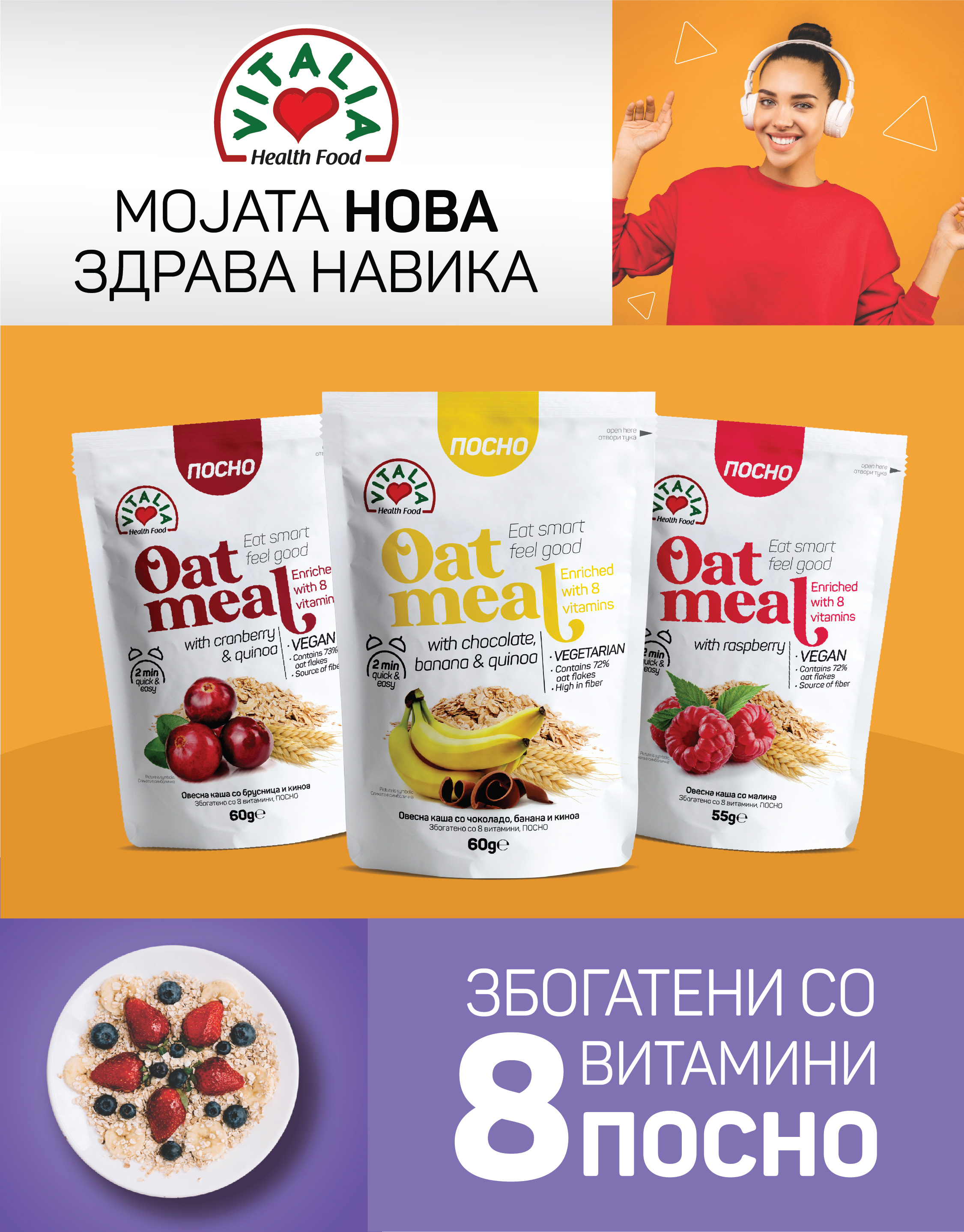 We have a great recommendation for you – Vitalia oat meals – a balanced combination of oat flakes, fruit, nuts and super foods. 100% natural product ready in just 2 minutes with a little water, milk, yogurt or natural juice.