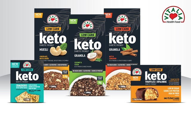 Breakfast: 4 tablespoons Vitalia Keto muesli with nuts and seeds soaked in 100ml coconut milk (unsweetened)