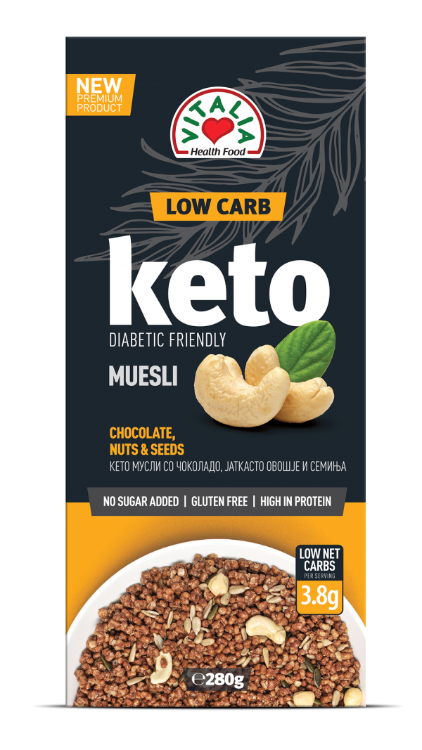Delicious combination of crunchy muesli, bittersweet dark chocolate, nutritious nuts and super seeds. Formulated with high quality ingredients and nutritionally balanced macros, keto muesli with nuts are a great choice for your morning ritual.
