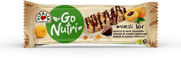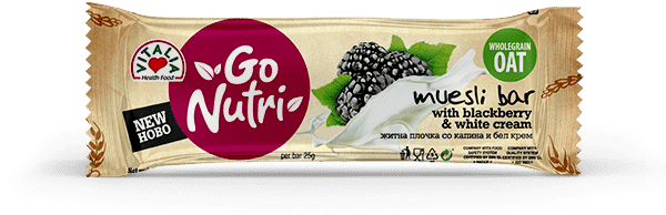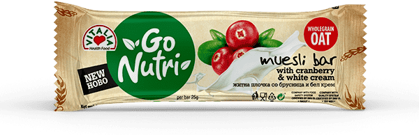 Go Nutri muesli bar is sweetened with natural sweeteners: honey, brown sugar Demerara and dark brown sugar Dark Muscovado. Light, nutritious and tasty cereal snack for any time of day.