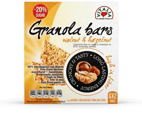Granola bar with walnut & hazelnut is a perfect combination of oat flakes and selected nuts, sweetened with brown sugar. Prepared by a special recipe, the bars will surprise your senses and provide you with a long-lasting energy.