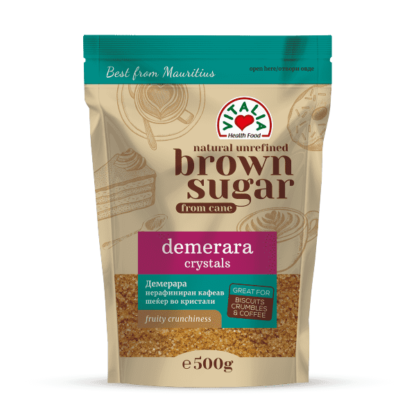 The brown sugar Demerara sugar crystals from Vitalia originates from the island of Mauritius in South Africa, where the tropical climate and uncontaminated soil enable the production of unrefined sugar with the highest quality in the world. Vitalia brown sugar is produced in a simple manner so as to retain, and not remove, the natural molasses of the sugar cane.