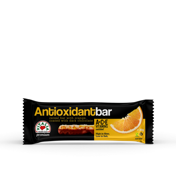Antioxidant cereal bar is a mix of crunchy cereals and orange enriched with vitamins A, C and E and it is half-coated in dark chocolate. This is a great sweet snack with essential natural antioxidants for achieving ideal body balance.