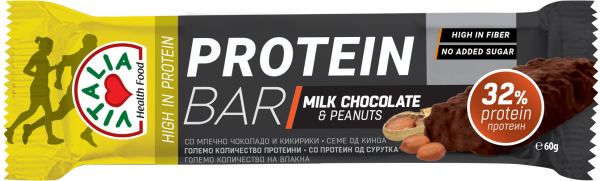 Excellent high protein bar with 32% protein (19.2 grams of protein per a 60g-bar). It is a balanced formula of high percentage of whey protein and naturally occurring proteins in peanuts and quinoa seed.