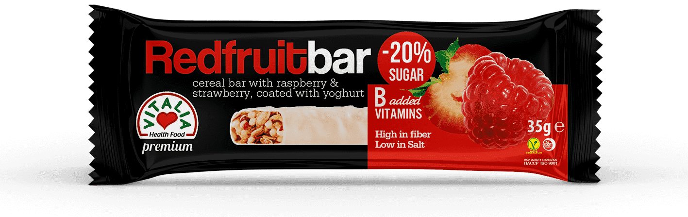 The cereal bar with red fruits and yogurt coating is an amazing mix of crunchy cereals and red forest fruits. It is supplemented with vitamin B, a full yogurt coating and enriched with calcium. It is a healthy, sweet snack with 100% natural ingredients which charmingly bring to you the incredible taste of nature and give you energy when you need it the most. This nutritional composition is ideal for children aged 10-14 years as a healthy and colorful snack. According to the latest research, children who consume cereals in the morning feel more agitated, happier and less anxious. In addition, the ability to remember words and information is significantly enhanced.